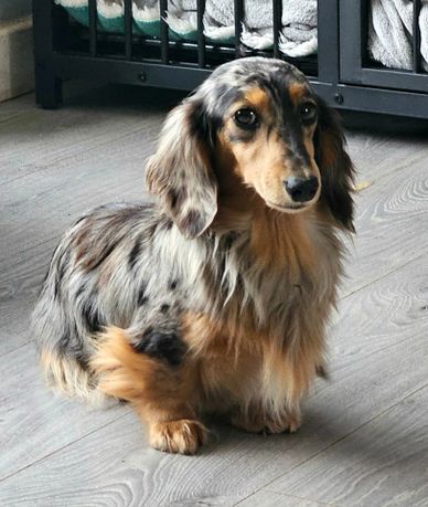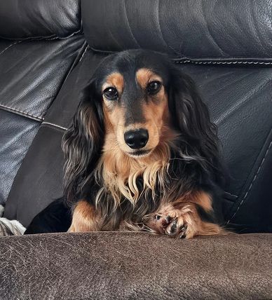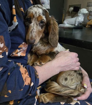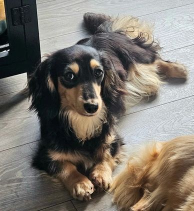 Esme is a Emmett baby which we fell in love with. She is a Chocolate Dapple and Tan Miniature Longhaired Dachshund. She is very sweet but also very loud lol she loves to play with a ball and also loves a squidge.