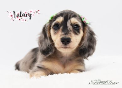 Aubrey is a Aspen baby who we decided to keep back as she is so so beautiful. She is a Silver Dapple & Cream Miniature Longhaired Dachshund. Aubrey is a quiet girl who loves a cuddle and like to give kisses. Her and Cricket are thick as thieves lol.