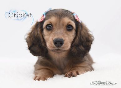 Cricket is a Harper & Mr Bear baby and definately has her mother's beasty streak lol. She is a Shaded Cream Miniature Longhaired Dachshund. Cricket is a little mischeif but we love her dearly.